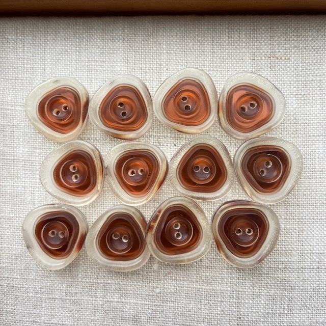 三角型ボタンの古いシート。 クリアな土台にブラウン系の着色。 サイズ ボタン横幅:約21mm 厚み:約5mm 1ダース:12個 での販売です。 経年のため、台紙の汚れ・劣化やボタン自体にも傷や汚れがある場合がございます。 画像のシートは一例です。お届けするシートとシミなどの状態が異なる場合がありますので、ご了承ください。 手作りアクセサリーの素材にいかがでしょうか。 かなり古い時代のボタンです。 劣化があるなど年代物なボタンということを十分ご理解いただき、購入をお願いいたします。 お使いのモニターや画面により色みが違って見える場合がございます。