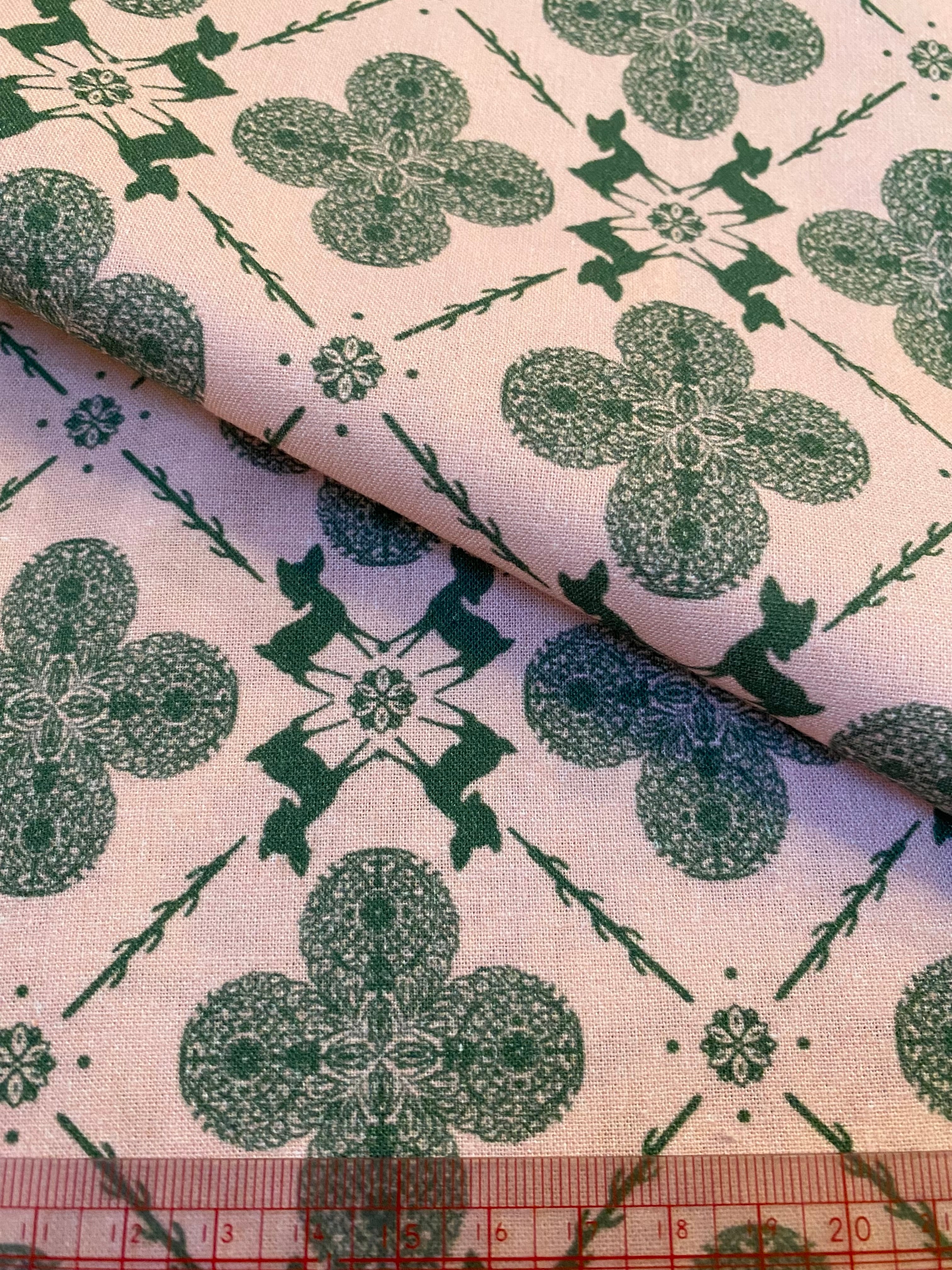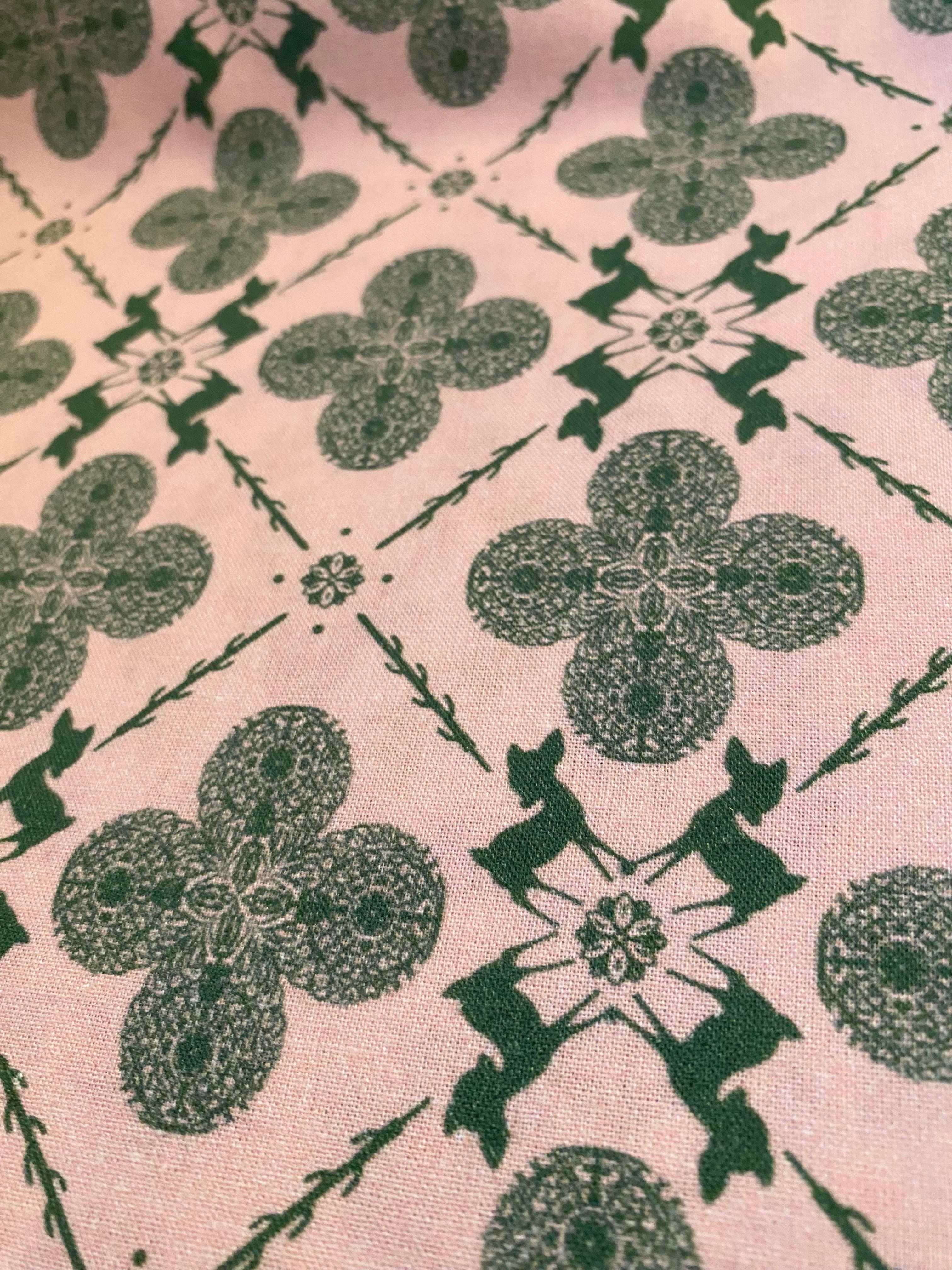 スモーキーなピンク地に森緑色の模様が落ち着いた雰囲気。細かい文様が目をひきます。