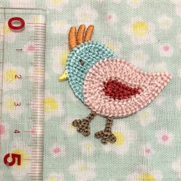 にわとりの色合いもかわいく、繊細なニットの網目のような刺繍。