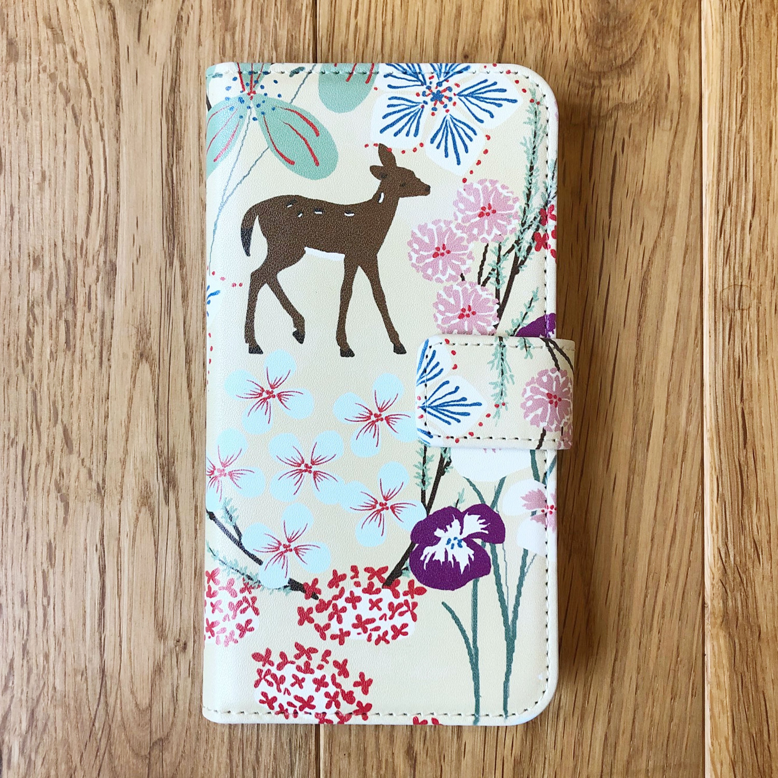 スマホ手帳型ケース 鹿柄オリジナル 「楚々の森」クリームイエロー